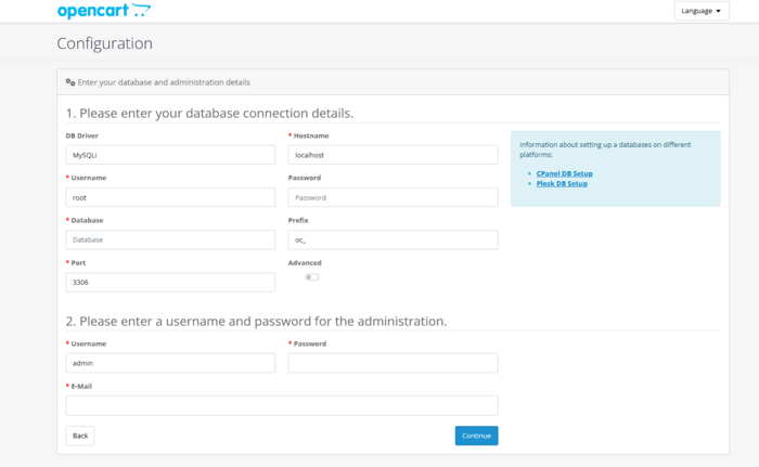 ) in your browser to launch the OpenCart web installer. The installation wizard will appear in the opened window, where you need to sequentially specify the site parameters:
