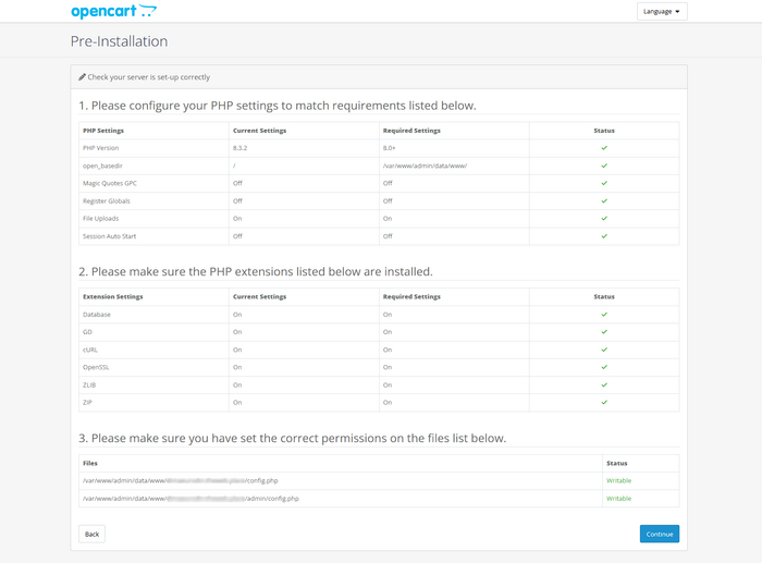 http://DOMAIN_NAMEorhttps://DOMAIN_NAME) in your browser to launch the OpenCart web installer. The installation wizard will appear in the opened window, where you need to sequentially specify the site parameters: