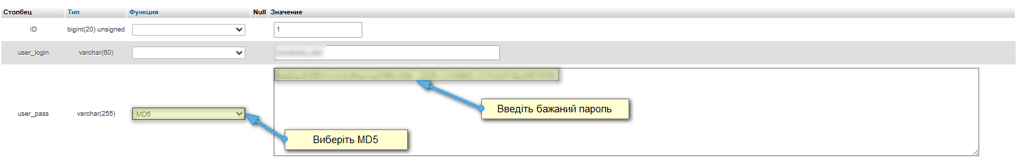 user_passвиберіть функціюMD5і введіть новий надійний пароль;