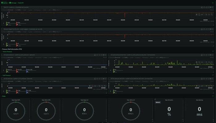 - Диск и файловая система: объём используемого и свободного дискового пространства на каждом разделе, а также производительность дисковой подсистемы – скорость чтения/записи (в байтах в секунду), количество операций ввода-вывода (IOPS). Отслеживая эти данные, можно увидеть, когда диск заполнен или когда происходят интенсивные операции ввода-вывода, влияющие на производительность. Netdata также может предупреждать о низком свободном месте на диске.