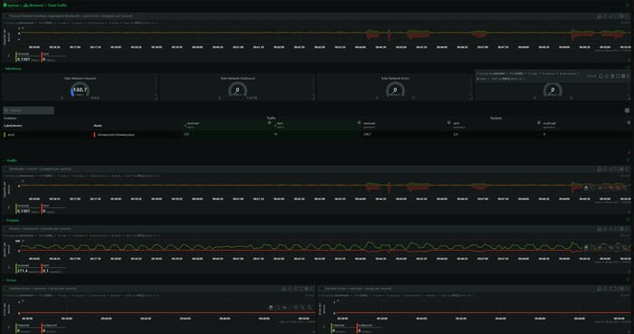 - Сетевой трафик: статистика по сетевым интерфейсам – входящая и исходящая скорость (байт/с), количество пакетов, ошибки и отбрасывания пакетов. Это позволит контролировать нагрузку на сеть, обнаруживать аномально высокий трафик или проблемы с сетью.